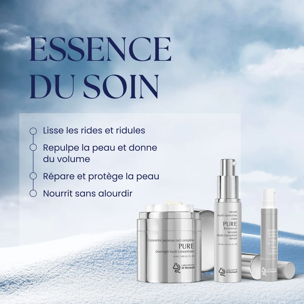 Il réunit le Sérum Multi-Correction Rides, qui agit sur les quatre types de rides et redonne fermeté et élasticité, le Soin Jeunesse Lèvres & Contour, qui repulpe et redéfinit le pourtour de la bouche, ainsi que le Concentré Jeunesse Nuit Complète, qui lisse et régénère la peau pendant le sommeil.